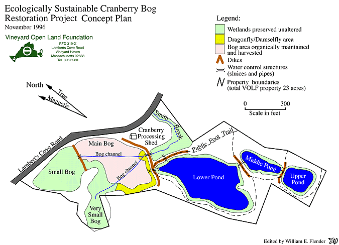 This area, formerly a defunct campground, was purchased by VOLF in 1983. Of the 8 house sites created one was contributed by VOLF for the Mary P. Wakeman Conservation Center. An additional adjacent property was subsequently purchased by the Wakeman Center to be used as an annex. The VOLF owned conservation land preserves a cranberry bog and three ponds. VOLF is actively working to restore the bog (see conceptual plan below) to organic production. There is a public walking trail around the large pond. Parking is available at the Wakeman Center 1 mile up from the lower end of the Lambert's Cove Road in Tisbury.